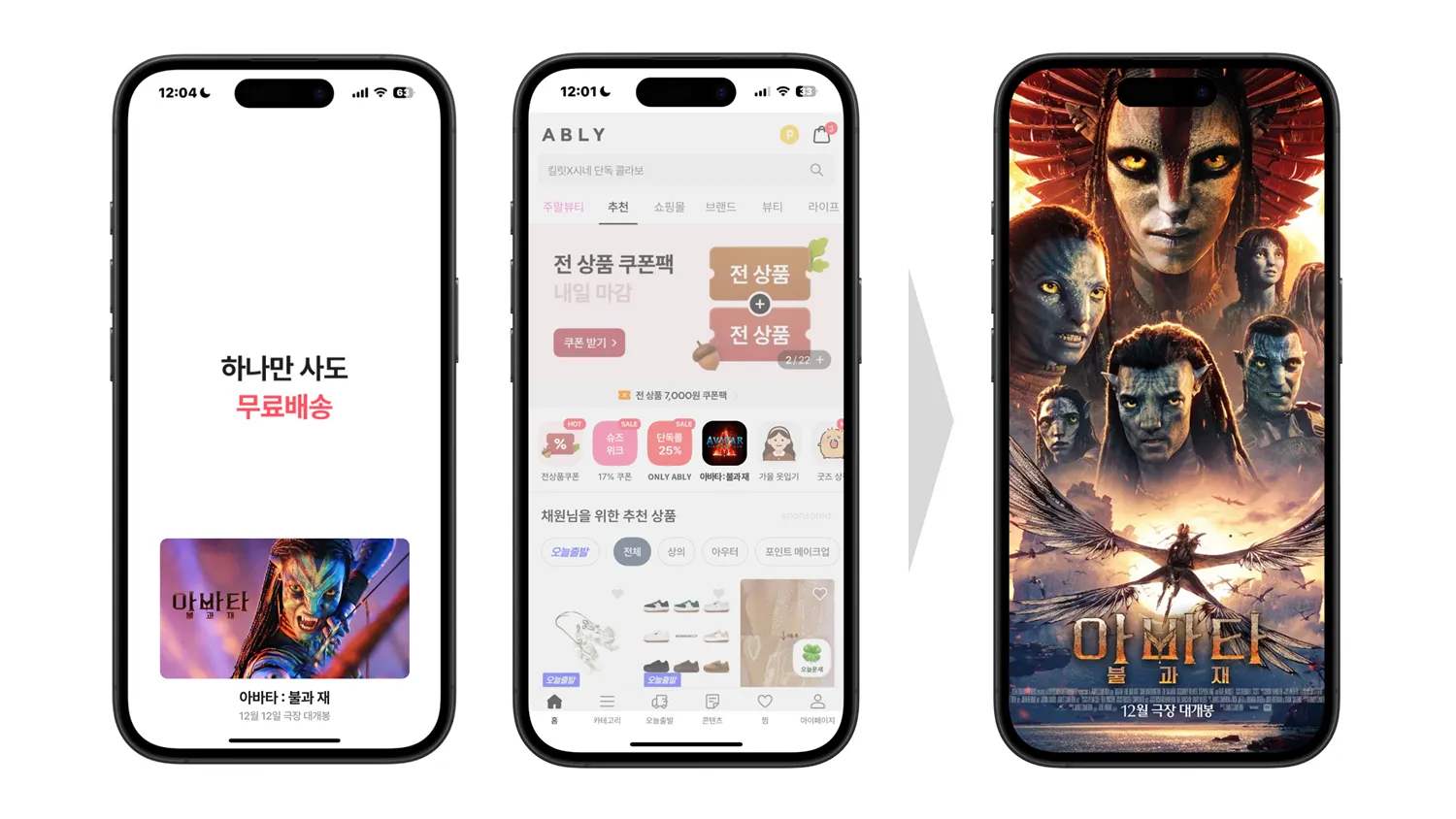 스플래시 등 대규모 노출 → 에이블리 앱 내 이벤트 페이지 랜딩 → 예매권/기대평 등 이벤트 참여