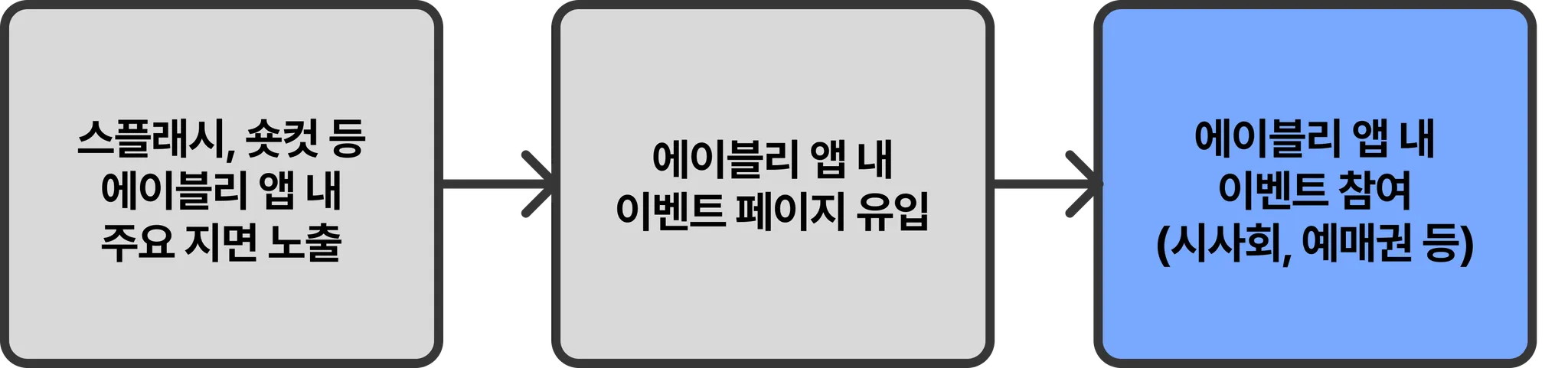 스플래시 등 대규모 노출 → 에이블리 앱 내 이벤트 페이지 랜딩 → 예매권/기대평 등 이벤트 참여