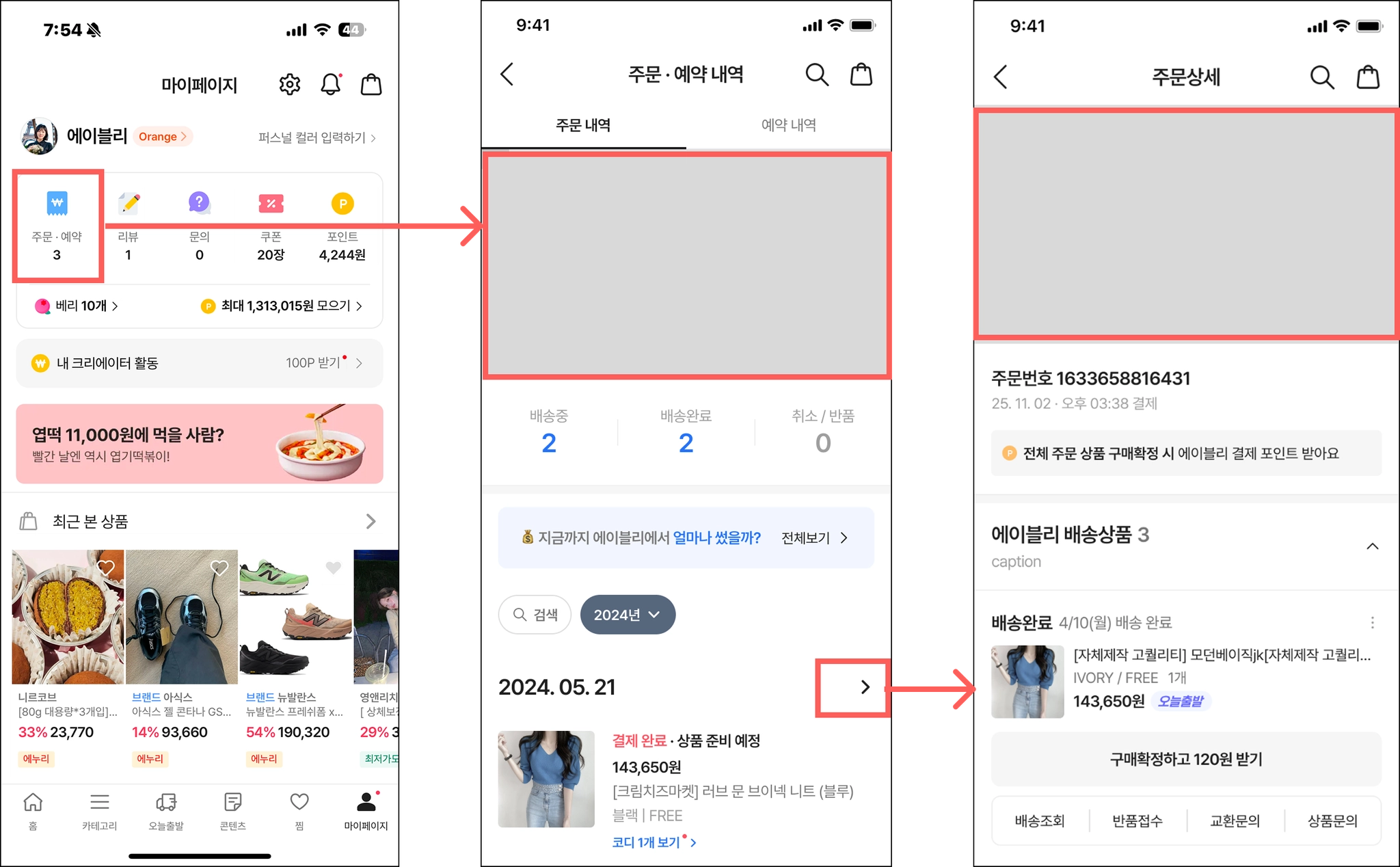 마이 페이지 → 주문/예약 페이지 → 개별 주문 건 클릭 → 주문 상세 페이지 이동